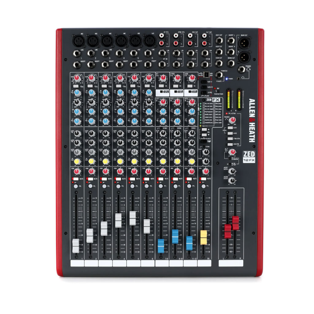Mixer Allen & Heath ZED-12FX là trợ thủ đắc lực cho live mixer của ae — và cũng sẵn sàng để thực hiện trong phòng thu. Nhờ vào 6 kênh mic/line có preamp xịn này mà ae có thể kết nối tất cả các mic và DI box ae cần. Ngoài ra, ae cũng có ba kênh dual stereo có sẵn, mỗi kênh có điều chỉnh độ nhạy và EQ 2 band. Tại đây, ae có thể chỉnh sửa với 16 effect riêng biệt của ZED-12FX, để tạo ra âm thanh trực tiếp hoàn hảo, tinh chỉnh.