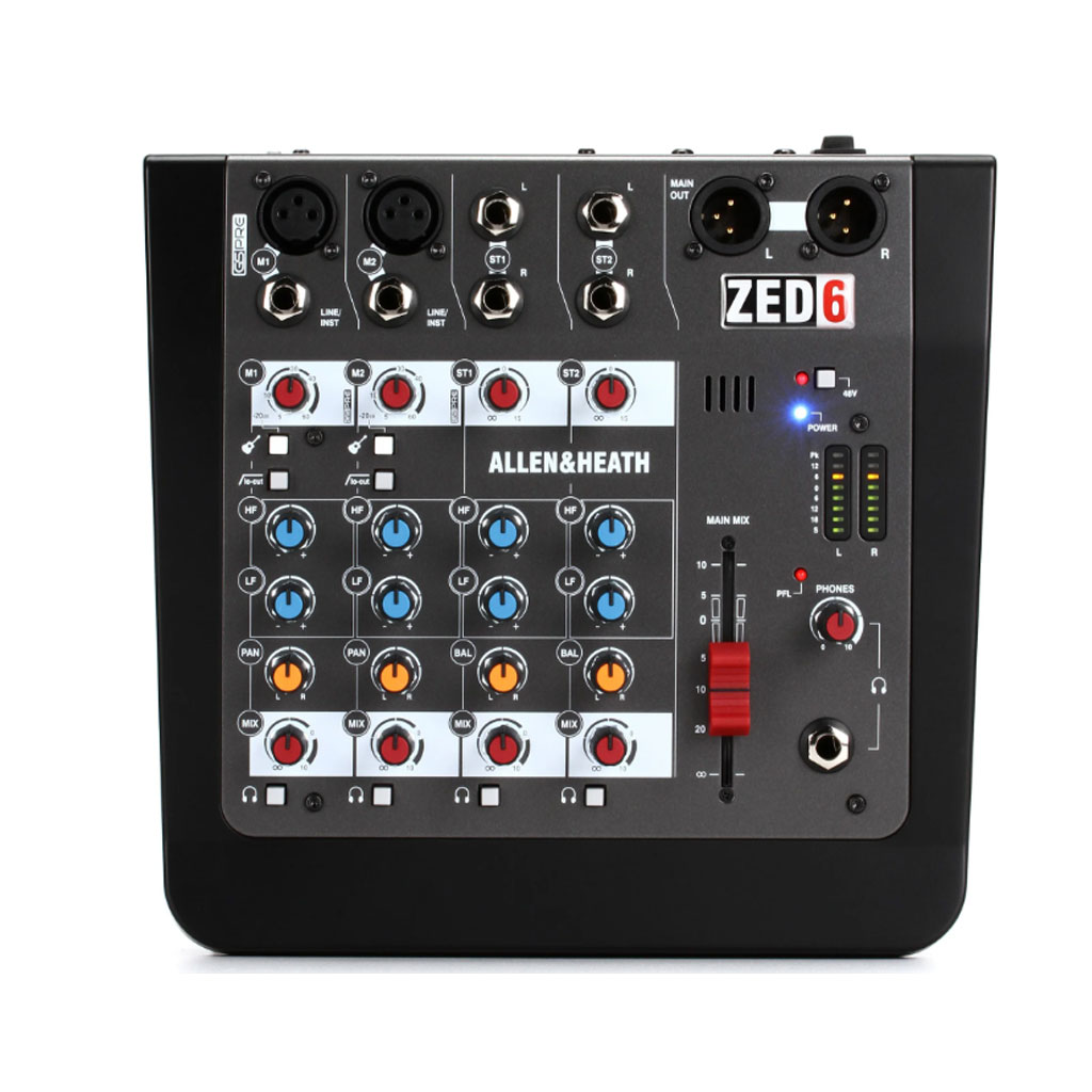 Mixer 6 kênh Allen & Heath ZED-6 mang lại chất lượng âm thanh tuyệt vời cho các ứng dụng trộn âm nhỏ gọn. Hai kênh mono với các preamp GSPre hỗ trợ micro (dynamic hoặc condenser), các nhạc cụ, hoặc các nguồn âm thanh line-level. Hai kênh stereo hoàn hảo cho các synth, drum machine, và các nguồn âm thanh line-level khác. Tất cả tinh hoa trong một thiết kế nhỏ gọn nhưng vững chắc, với các điều khiển xoay được cố định vào bảng điều khiển trước bằng một ốc thép để đảm bảo độ bền tối đa.