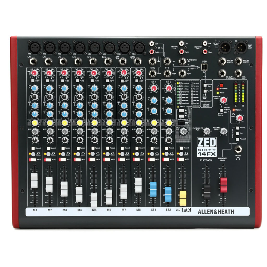 Allen & Heath ZED60-14FX mang lại cảm giác chắc chắn với các fader 60mm trên bảng mixer phổ biến ZED-10FX, hai trong số bốn kênh mono của nó có các cổng vào có trở kháng cao, tái tạo được sự ấm áp và đặc trưng của một classic tube preamp. Thiết kế EQ 3 band phản ứng nhanh của ZED60-14FX tích hợp công nghệ MusiQ của A & H — variable Q có thể điều chỉnh giúp tối ưu hóa cài đặt âm sắc của mỗi nhạc cụ trở nên dễ dàng. Ae cũng được trang bị hiệu ứng digital chất lượng cao tích hợp sẵn, và kết nối âm thanh USB stereo để ghi lại các bản thu nhanh chóng.