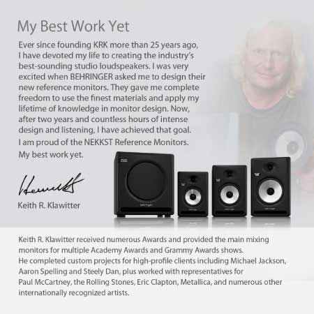 Khi Behringer quyết định muốn tạo ra một bộ loa kiểm âm phòng thu đặc biệt, họ đã liên hệ với một trong những nhà thiết kế loa nổi tiếng nhất thế giới - người sáng lập KRK, Keith R. Klawitter. Keith đã thiết kế nón loa bằng sợi thủy tinh độc đáo, nổi tiếng với âm bass vượt trội và phản hồi nhất thời. Kết hợp với loa tweeter vòm lụa "Advanced Waveguide Technology" của Keith, bro có thể mong đợi những âm bass mạnh mẽ, âm mid chi tiết và âm cao mượt mà từ Behringer Nekkst K8 .