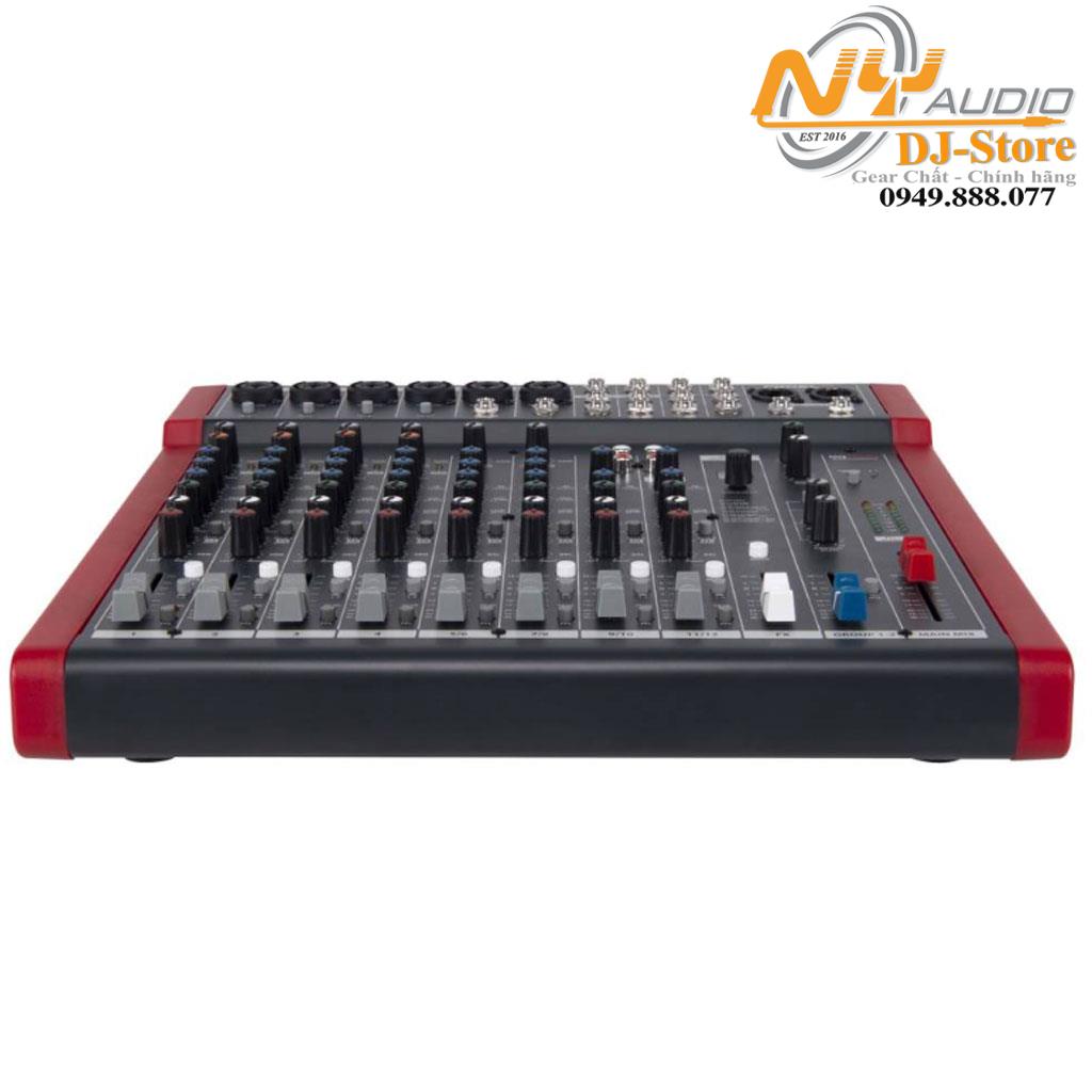 Ngõ vào (Inputs): 4 x Mic/Line (XLR + Jack, CH1–4, có Compressor) Ngõ vào Stereo Line: Jack, RCA