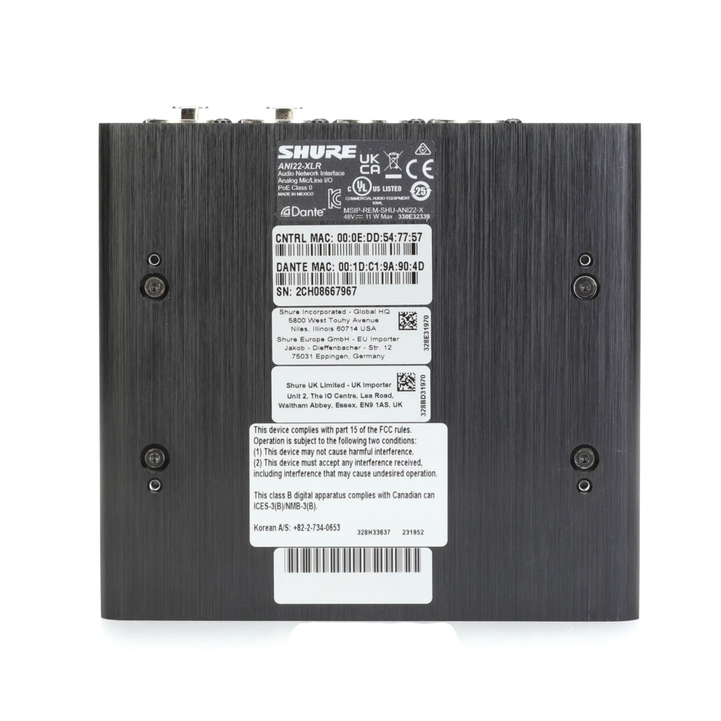 Shure ANI22-XLR được trang bị hai cổng input XLR, cho phép kết nối với nhiều loại micro và thiết bị âm thanh khác nhau. Các cổng này hỗ trợ nguồn cấp tín hiệu từ các thiết bị âm thanh chất lượng cao và đảm bảo âm thanh được ghi nhận với độ rõ nét và chi tiết tối ưu. Đồng thời, thiết bị còn có cổng output Dante™ cho phép dễ dàng kết nối với hệ thống âm thanh kỹ thuật số hoặc thiết bị ghi âm khác.