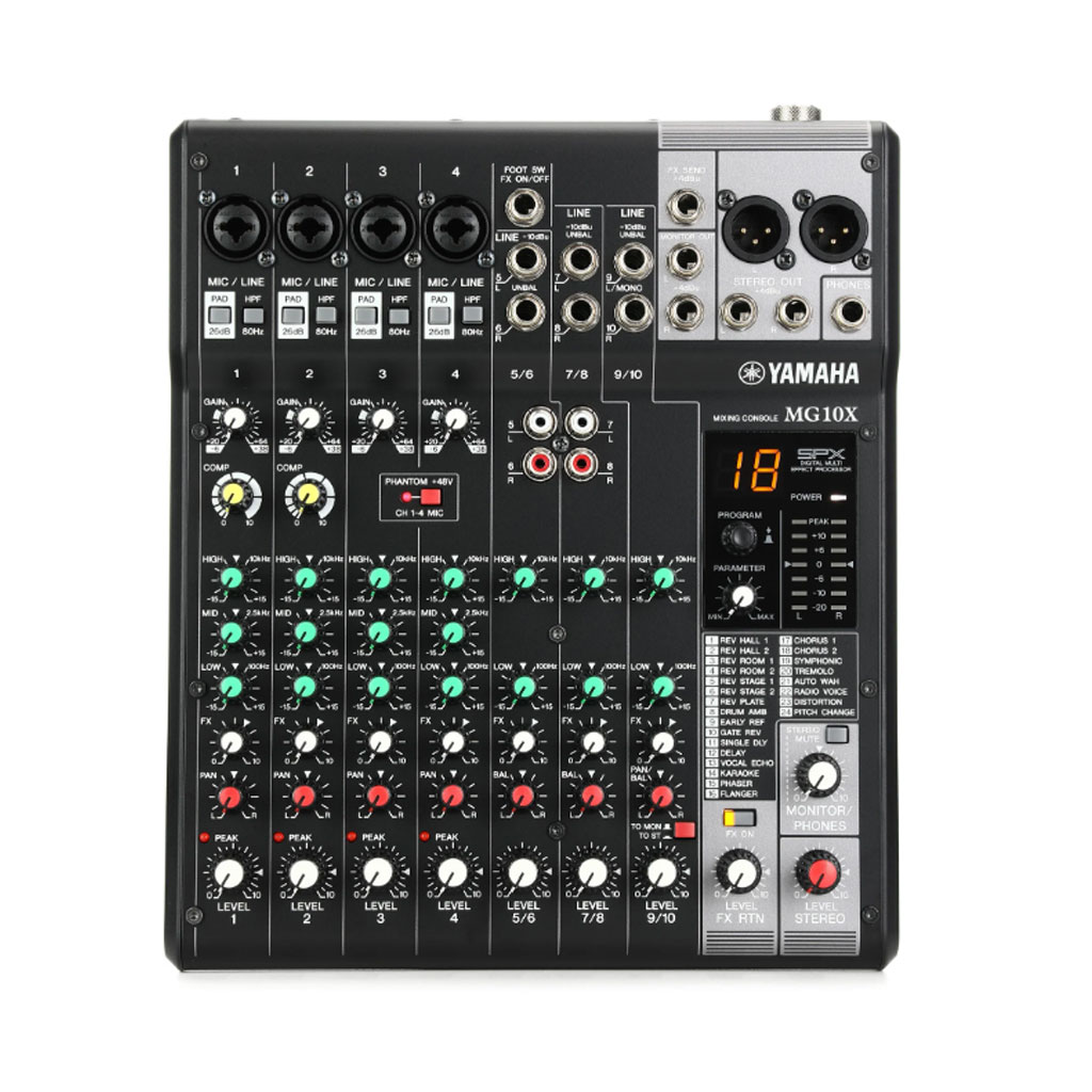 Một trong những điểm ăn tiền của MG10X CV là bộ preamp mic D-PRE, sử dụng mạch khuếch đại đảo ngược Darlington, cung cấp âm thanh ấm áp, giàu chi tiết và độ méo thấp. Điều này giúp cải thiện chất lượng âm thanh input, đặc biệt là khi sử dụng micro để thu âm giọng hát hoặc nhạc cụ. Yamaha MG10X CV tích hợp bộ xử lý hiệu ứng SPX với 24 hiệu ứng digital, bao gồm reverb, delay, chorus, flanger, và nhiều hiệu ứng khác. Các hiệu ứng này giúp ae dễ dàng tạo ra các âm thanh chuyên nghiệp và phong phú, phù hợp với nhiều loại hình biểu diễn và thu âm. Mỗi kênh mono của MG10X CV được trang bị EQ 3-band (Bass, Mid, Treble), cho phép ae điều chỉnh tần số âm thanh theo ý muốn. Ngoài ra, bàn mixing còn có bộ lọc cắt thấp (high-pass filter) giúp loại bỏ các tần số thấp không mong muốn, như tiếng ồn và âm thanh nền, đảm bảo âm thanh output luôn trong trẻo và rõ ràng.